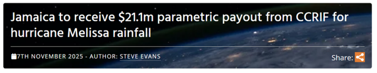 Melissa made landfall as a Category 5 storm in Jamaica (28 October 2025) which made a combination of insurance and catastrophe bonds pay out to help the country rebuild.
